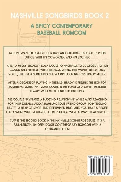 No one wants to catch their husband cheating. Especially in his office. With his coworker. And his brother. After a messy breakup, Lola moves to Nashville to be closer to her cousin and friends. While rediscovering her wants, needs, and voice, she finds something she wasn't looking for: Brady Miller. After a decade of playing in the MLB, Brady is feeling the itch for something more. That more comes in the form of a sweet, resilient beauty who moved into his building. The couple navigates a budding relationship while also reaching for their dreams. Add a rambunctious friend group, toe-tingling banter, a heap of spice, and determined MMC, and you have a recipe for a whirlwind romance. If only things were always that simple... Lola After splitting from my gaslighting college sweetheart, I move to Nashville to be closer to my support system. My first attempt to get back on (under?) the horse ends up in a disaster and I decide to focus on me, especially after learning my crush and in-law's teammate was my mystery play partner. Unfortunately he has other plans. Through a lot of effort and a little dominance, Brady wins me over and shows me what a true partnership looks like. After the press publishes some misconstrued pictures, I realize I lost my way during our whirlwind romance and jump back into my journey of self-discovery. Once I find my footing, I can't help but wonder if there is room for the new me in the arms of the man who showed me what love is supposed to be. Brady After scarring off a new playmate, the only thing that takes my mind off the woman is my teammates gorgeous cousin. At first it seems like she is into me, too, but something flips and she can't get away from me fast enough. Turns out, she is my mystery girl and reeling with trust issues and baggage thanks to her ex-husband and parents. I do what I can to show Lola what it's like to be truly care for and supported until a miscommunication causes her to flee and decide she was relying to heavily on me and not dealing with her own issues. All I can do is give her the time and space to find the strength within herself and hope that when we come out the other side I am still the man she wants. SUTP is the second book in the Nashville Songbirds Series and part of the Nashverse interconnected universe to come. It is a full-length, 18+ open door contemporary romcom with a guaranteed HEA!
