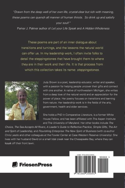 Judy Brown is a poet, leadership educator, writer and speaker, with a passion for helping people uncover their gifts and connect with one another. A native of northwestern Michigan, she writes from a deep love of the natural world and an appreciation for the power of place. Her poetry focuses on transitions and learning from nature. Her leadership work is in the fields of the arts, government, health and elder services. She holds a PhD in Comparative Literature, is a former White House Fellow, and has been affiliated with The Aspen Institute and The University of Maryland. Her other books include The Choice, The Sea Accepts All Rivers, A Leader's Guide to Reflective Practice, Simple Gifts, The Art and Spirit of Leadership, and Flourishing Enterprise: The New Spirit of Business (with co-author Chris Laszlo and other colleagues at the Fowler Center at Case Western Reserve University). She lives with her husband David on a small tidal creek near the Chesapeake Bay, where they can kayak off their front lawn.