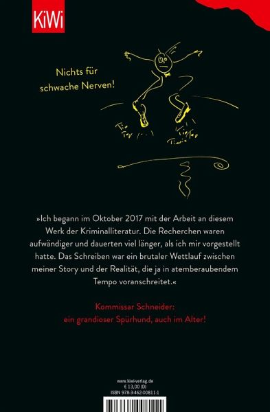 Bei der Abgabe des Manuskripts für dieses Buch schrieb Helge Schneider an den Verlag: »Ich begann 2017 mit der Arbeit an diesem Bestseller. Es war mir klar, dass die Geschichte einschlägt wie ein Blitz aus heiterem Himmel. Die Recherchen waren aufwändiger, als ich mir vorgestellt hatte, denn das Schreiben war ein brutaler Wettlauf zwischen meiner Story und der Realität, die ja in atemberaubendem Tempo voranschreitet. Grismann, was für ein Intelligenzverbrecher! Johnny Espelkamp, was für ein dumpfer Mörder! Jerry Vogel, was für ein faszinierender, aber undurchsichtiger Tanzlehrer. Und der Kommissar Schneider - zu welch grandiosem Spürhund ist dieser Mann im Alter noch aufgestiegen! Unglaubliche Entwicklungen, man kann sich an den Zeilen nicht satt lesen. Aber ich will hier nicht zu viel verraten. Nur eins ist sicher: Nichts für schwache Nerven. Dazu habe ich 18 draws (Zeichnungen) angefertigt, die das Gesamtbild der Ereignisse abrunden.«