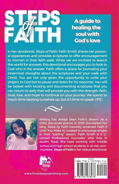 In her devotional, Steps of Faith, Faith Smith shares her personal experiences and provides scriptures to offer encouragement to women in their faith walk. While we are inclined to search the world for answers, this devotional encourages you to look to God who is the answer. Faith offers a space for journaling your innermost thoughts about the scriptures and your walk with Christ. You are not only given the opportunity to write your prayers to God but to pause and listen for his response. You will be tasked with locating and documenting scriptures that you can return to daily that will provide you with the strength, faith, trust, love, and hope to continue on your journey. We spend so much time beating ourselves up, but it's time to speak LIFE.