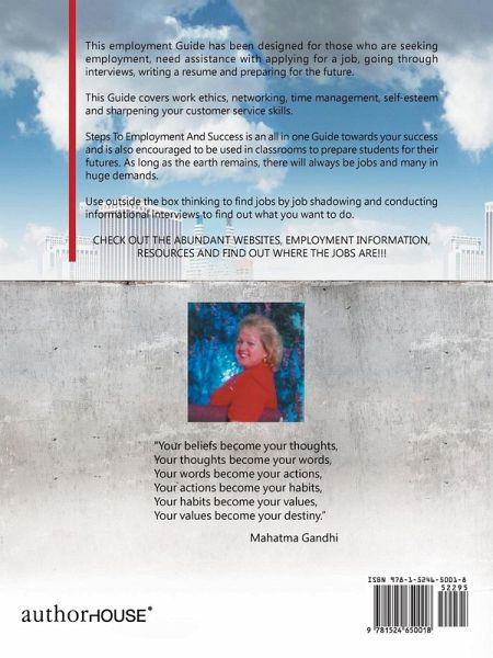 This employment guide has been designed for those who are seeking employment, need assistance with applying for a job, going through interviews, writing a resume, and preparing for the future. This guide covers work ethics, networking, time management, self-esteem, and sharpening your customer service skills. Steps to Employment and Success is an all-in-one guide toward your success and is also encouraged to be used in classrooms to prepare students for their futures. As long as the earth remains, there will always be jobs and many in huge demands. Use outside-the-box thinking to find jobs by hob job shadowing and conducting informational interviews to find out what you want to do. Check out the abundant websites, employment information, resources, and find out where the jobs are!