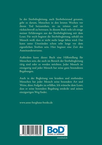 In der Sterbebegleitung, auch Sterbebeistand genannt, geht es darum, Menschen in den letzten Wochen vor ihrem Tod beizustehen, sie zu trösten und sie rücksichtsvoll zu betreuen. In diesem Buch teile ich einige meiner Erfahrungen aus der Sterbebegleitung mit dem Leser. Für mich beginnt die Sterbebegleitung, sobald ein Mensch weiß, dass er nicht mehr lange leben wird. Das kann unter Umständen schon sehr lange vor dem eigentlichen Sterben sein. Hier beginnt eine Zeit des Auseinandersetzens. Außerdem kann dieses Buch eine Hilfestellung für Menschen sein, die auch im Bereich der Sterbebegleitung tätig sind oder es werden möchten. Jeder Mensch ist einzigartig und jeder Mensch hat seine ganz besonderen Begabungen.Auch in der Begleitung von kranken und sterbenden Menschen hat jeder Mensch seine besondere Art und Weise, diese Aufgabe zu erfüllen. Ich wünsche dem Leser, dass er seine besondere Begabung entdeckt und seinen einzigartigen Weg findet.