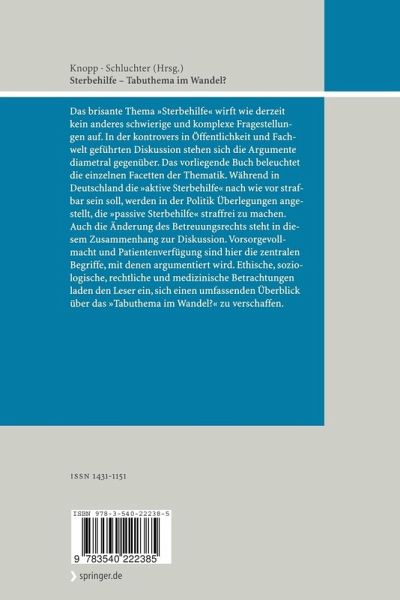 Das brisante Thema "Sterbehilfe" wirft wie derzeit kein anderes schwierige und komplexe Fragestellungen auf. In der kontrovers in Öffentlichkeit und Fachwelt geführten Diskussion stehen sich die Argumente diametral gegenüber. Das vorliegende Buch beleuchtet die einzelnen Facetten der Thematik. Während in Deutschland die "aktive Sterbehilfe" nach wie vor strafbar sein soll, werden in der Politik Überlegungen angestellt, die "passive Sterbehilfe" straffrei zu machen. Auch die Änderung des Betreuungsrechts steht in diesem Zusammenhang zur Diskussion. Vorsorgevollmacht und Patientenverfügung sind hier die zentralen Begriffe, mit denen argumentiert wird. Ethische, soziologische, rechtliche und medizinische Betrachtungen laden den Leser ein, sich einen umfassenden Überblick über das "Tabuthema im Wandel?" zu verschaffen.
