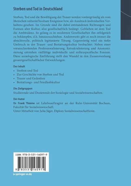 Sterben, Tod und die Bewältigung der Trauer werden vordergründig als vom Menschen unbeeinflussbare Ereignisse bzw. als Ausdruck individuellen Verhaltens gesehen. Im Grunde sind die dabei entstandenen Richtungen und Formen aber Kultur, also gesellschaftlich bedingt. Geblieben ist dem Tod die Ambivalenz. So gelang es in modernen Gesellschaften ihn erfolgreich zu bekämpfen, d.h. hinauszuschieben. Andererseits gibt es noch immer die absichtsvolle, politisch legitimierte Tötung. Gegenwärtig wird ein tiefer Umbruch in der Trauer- und Bestattungskultur beobachtet. Neben einer voranschreitenden Professionalisierung, Entsakralisierung und Anonymisierung entstehen vielfältige individuelle und milieuspezifische Formen. Diese soziologische Einführung stellt den Wandel in den Zusammenhang gesamtgesellschaftlicher Entwicklungen.