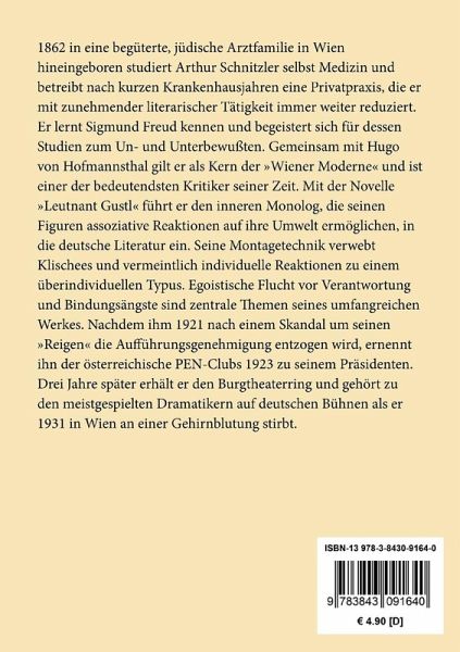 1862 in eine begüterte, jüdische Arztfamilie in Wien hineingeboren studiert Arthur Schnitzler selbst Medizin und betreibt nach kurzen Krankenhausjahren eine Privatpraxis, die er mit zunehmender literarischer Tätigkeit immer weiter reduziert. Er lernt Sigmund Freud kennen und begeistert sich für dessen Studien zum Un- und Unterbewußten. Gemeinsam mit Hugo von Hofmannsthal gilt er als Kern der "Wiener Moderne" und ist einer der bedeutendsten Kritiker seiner Zeit. Mit der Novelle "Leutnant Gustl" führt er den inneren Monolog, die seinen Figuren assoziative Reaktionen auf ihre Umwelt ermöglichen, in die deutsche Literatur ein. Seine Montagetechnik verwebt Klischees und vermeintlich individuelle Reaktionen zu einem überindividuellen Typus. Egoistische Flucht vor Verantwortung und Bindungsängste sind zentrale Themen seines umfangreichen Werkes. Nachdem ihm 1921 nach einem Skandal um seinen "Reigen" die Aufführungsgenehmigung entzogen wird, ernennt ihn der österreichische PEN-Clubs 1923 zu seinem Präsidenten. Drei Jahre später erhält er den Burgtheaterring und gehört zu den meistgespielten Dramatikern auf deutschen Bühnen als er 1931 in Wien an einer Gehirnblutung stirbt.