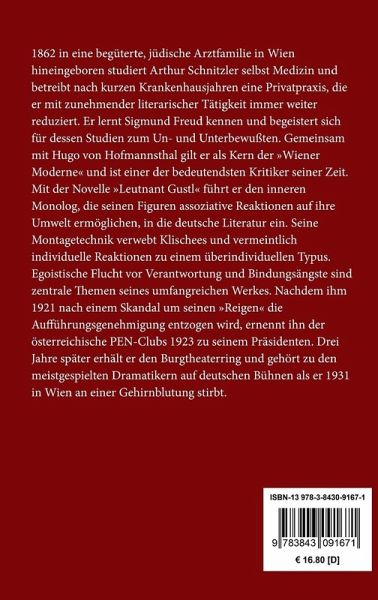 1862 in eine begüterte, jüdische Arztfamilie in Wien hineingeboren studiert Arthur Schnitzler selbst Medizin und betreibt nach kurzen Krankenhausjahren eine Privatpraxis, die er mit zunehmender literarischer Tätigkeit immer weiter reduziert. Er lernt Sigmund Freud kennen und begeistert sich für dessen Studien zum Un- und Unterbewußten. Gemeinsam mit Hugo von Hofmannsthal gilt er als Kern der "Wiener Moderne" und ist einer der bedeutendsten Kritiker seiner Zeit. Mit der Novelle "Leutnant Gustl" führt er den inneren Monolog, die seinen Figuren assoziative Reaktionen auf ihre Umwelt ermöglichen, in die deutsche Literatur ein. Seine Montagetechnik verwebt Klischees und vermeintlich individuelle Reaktionen zu einem überindividuellen Typus. Egoistische Flucht vor Verantwortung und Bindungsängste sind zentrale Themen seines umfangreichen Werkes. Nachdem ihm 1921 nach einem Skandal um seinen "Reigen" die Aufführungsgenehmigung entzogen wird, ernennt ihn der österreichische PEN-Clubs 1923 zu seinem Präsidenten. Drei Jahre später erhält er den Burgtheaterring und gehört zu den meistgespielten Dramatikern auf deutschen Bühnen als er 1931 in Wien an einer Gehirnblutung stirbt.
