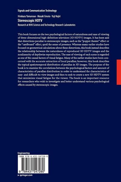 This book focuses on the two psychological factors of naturalness and ease of viewing of three-dimensional high-definition television (3D HDTV) images. It has been said that distortions peculiar to stereoscopic images, such as the "puppet theater" effect or the "cardboard" effect, spoil the sense of presence. Whereas many earlier studies have focused on geometrical calculations about these distortions, this book instead describes the relationship between the naturalness of reproduced 3D HDTV images and the nonlinearity of depthwise reproduction. The ease of viewing of each scene is regarded as one of the causal factors of visual fatigue. Many of the earlier studies have been concerned with the accurate extraction of local parallax; however, this book describes the typical spatiotemporal distribution of parallax in 3D images. The purpose of the book is to examine the correlations between the psychological factors and amount of characteristics of parallax distribution in order to understand the characteristics of easy- and difficult-to-view images and then to seek to create a new 3D HDTV system that minimizes visual fatigue for the viewer. The book is an important resource for researchers who wish to investigate and better understand various psychological effects caused by stereoscopic images.