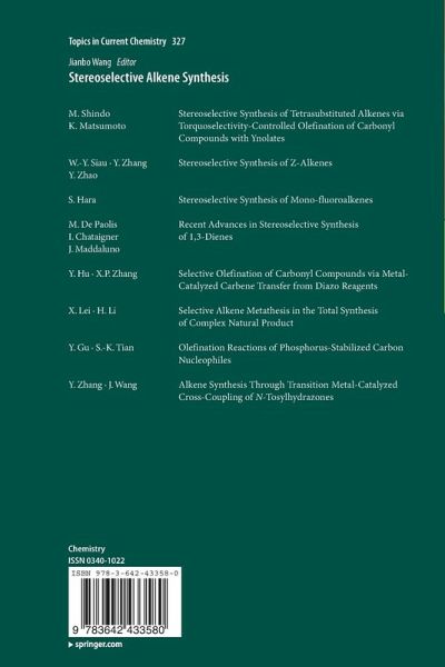 Stereoselective Synthesis of Tetrasubstituted Alkenes via Torquoselectivity-Controlled Olefination of Carbonyl Compounds with Ynolates, by Mitsuru Shindo and Kenji Matsumoto.- Stereoselective Synthesis of Z-Alkenes, by Woon-Yew Siau, Yao Zhang and Yu Zhao.- Stereoselective Synthesis of Mono-fluoroalkenes, by Shoji Hara.- Recent Advances in Stereoselective Synthesis of 1,3-Dienes, by Michael De Paolis, Isabelle Chataigner and Jacques Maddaluno.- Selective Olefination of Carbonyl Compounds via Metal-Catalyzed Carbene Transfer from Diazo Reagents, by Yang Hu and X. Peter Zhang.- Selective Alkene Metathesis in the Total Synthesis of Complex Natural Product, by Xiaoguang Lei and Houhua Li.- Olefination Reactions of Phosphorus-Stabilized Carbon Nucleophiles, by Yonghong Gu and Shi-Kai Tian.- Alkene Synthesis Through Transition Metal-Catalyzed Cross-Coupling of N-Tosylhydrazones, by Yan Zhang and Jianbo Wang.