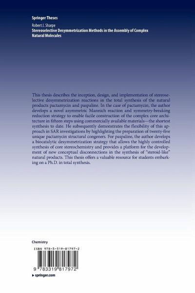 This thesis describes the inception, design, and implementation of stereoselective desymmetrization reactions in the total synthesis of the natural products pactamycin and paspaline. In the case of pactamycin, the author develops a novel asymmetric Mannich reaction and symmetry-breaking reduction strategy to enable facile construction of the complex core architecture in fifteen steps using commercially available materials - the shortest synthesis to date. He subsequently demonstrates the flexibility of this approach in SAR investigations by highlighting the preparation of twenty-five unique pactamycin structural congeners. For paspaline, the author develops a biocatalytic desymmetrization strategy that allows the highly controlled synthesis of core stereochemistry and provides a platform for the development of new conceptual disconnections in the synthesis of "steroid-like" natural products. This thesis offers a valuable resource for students embarking on a PhD in total synthesis.