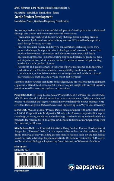Basic Principles of Sterile Product Formulation Development.- Molecule and Manufacturability Assessment Leading to Robust Commercial Formulation for Therapeutic Proteins.- Polymer and Lipid Based Systems for Parenteral Drug Delivery.- Formulation Approaches and Strategies for PEGylated Biotherapeutics.- Nasal Delivery.- Formulation Approaches and Strategies for Vaccines and Adjuvants.- Challenges in Freeze-Thaw Processing of Bulk Protein Solutions.- Best Practices for Technology Transfer of Sterile Products: Case Studies.- Transfer Across Barrier Systems: A New Source of Simplification in Aseptic Fill and Finish Operations.- Challenges and Innovation in Aseptic Filling: Case Study with the Closed Vial Technology.- Contemporary Approaches to Development and Manufacturing of Lyophilized Parenterals.- Advances in Container Closure Integrity Testing.- Pen and Autoinjector Drug Delivery Devices.- Particulate Matter in Sterile Parenteral Products.- Appearance Evaluation of Parenteral Pharmaceutical Products.- Sterile Filtration Principles, Best Practices and New Developments.- Intravenous Admixture Compatibility for Sterile Products: Challenges and Regulatory Guidance.- Basics of Sterilization Methods.- Avoiding Common Errors during Viable Microbial Contamination Investigations.- Validation of Rapid Microbiology Methods (RMMs).- Validation of Moist and Dry Heat Sterilization.