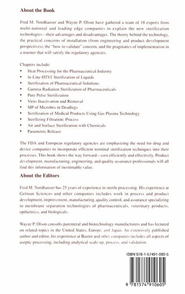 Editors Fred M. Nordhauser and Wayne P. Olson have gathered a team of 18 experts from multi-national and leading edge companies to explore the advantages and disadvantages of current sterilization technologies. They cover the theory behind the technology, the practical concerns of installation from engineering and product development perspectives, the "how to validate" concern, and the pragmatics of implementation in a manner that will satisfy the regulatory agencies. The broad range of in-depth information on numerous technologies will help readers design sterile manufacturing processes cost effectively and efficiently.
