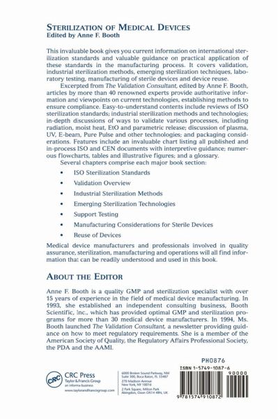 This book presents vital information on international sterilization standards and guidance on practical application of these standards in the manufacturing process. It covers validation, industrial sterilization methods, emerging sterilization techniques, laboratory testing, manufacturing of sterile devices, and device reuse. Excerpted from The Validator, edited by Anne F. Booth, more than fifty experts share their knowledge of current technologies in easy-to-understand articles that establish methods to ensure compliance. Contents include reviews of ISO sterilization standards, industrial sterilization methods and technologies, and support testing methodologies.