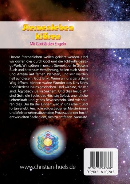 Unsere Sternenleben wollen geklärt werden. Und wir dürfen dies durch Gott und die lichtvolle geistige Welt. Wir spüren in unsere Sterneleben in diesem Buch und bitten um Versöhnung, heilen auch Ahnen und Anteile auf fernen Planeten, und wir werden heil auf diesem. Gott lenkt. Wenn wir uns ganz dem Weg öffnen, können wahre Wunder des Eins-Seins und Friedens in uns geschehen. Und wir sind, die wir sind. Ägyptisch: Ba Ra Sekhem. Und dies heißt: Wir sind Gott, die Seele, das Höchste Selbst, unendliche Lebenskraft und reines Bewussstsein. Und wir spüren dies. Der Ba der Einheit wird in uns erhellt und fortan erlebt. Auch die aufgestiegenen Meisterinnen und Meister unterstützen den Prozess, der der hochentwickelten Seele dient, sich zu entfalten. Namasté.