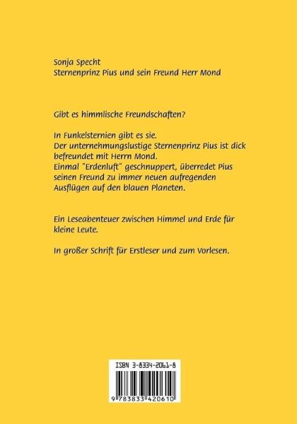 Gibt es himmlische Freundschaften? In Funkelsternien gibt es sie. Der unternehmungslustige Sternenprinz Pius ist dick befreundet mit Herrn Mond. Einmal ¿Erdenluft¿ geschnuppert, überredet Pius seinen Freund zu immer neuen aufregenden Ausflügen auf den blauen Planeten. Ein Leseabenteuer zwischen Himmel und Erde für kleine Leute. Mit vielen wunderschönen farbigen Illustrationen, in großer Schrift für Erstleser und zum Vorlesen.