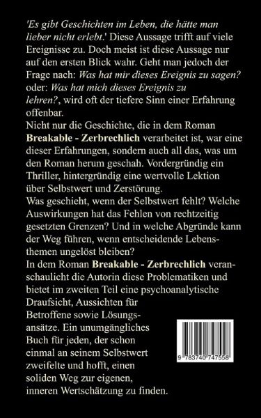 'Es gibt Geschichten im Leben, die hätte man lieber nicht erlebt.' Diese Aussage trifft auf viele Ereignisse zu. Doch meist ist diese Aussage nur auf den ersten Blick wahr. Geht man jedoch der Frage nach: Was hat mir dieses Ereignis zu sagen? oder: Was hat mich dieses Ereignis zu lehren? , wird oft der tiefere Sinn einer Erfahrung offenbar. Nicht nur die Geschichte, die in dem Roman Breakable - Zerbrechlich verarbeitet ist, war eine dieser Erfahrungen, sondern auch all das, was um den Roman herum geschah. Vordergründig ein Thriller, hintergründig eine wertvolle Lektion über Selbstwert und Zerstörung. Was geschieht, wenn der Selbstwert fehlt? Welche Auswirkungen hat das Fehlen von rechtzeitig gesetzten Grenzen? Und in welche Abgründe kann der Weg führen, wenn entscheidende Lebensthemen ungelöst bleiben? In dem Roman Breakable - Zerbrechlich veranschaulicht die Autorin diese Problematiken und bietet im zweiten Teil eine psychoanalytische Draufsicht, Aussichten für Betroffene sowie Lösungsansätze. Ein unumgängliches Buch für jeden, der schon einmal an seinem Selbstwert zweifelte und hofft, einen soliden Weg zur eigenen, inneren Wertschätzung zu finden.Webseite der Autorin: www.antonia-katharina.de