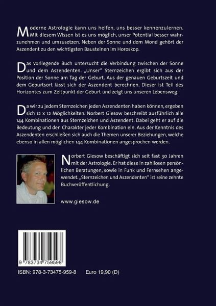 Moderne Astrologie kann uns helfen, uns besser kennenzulernen. Mit diesem Wissen ist es uns möglich, unser Potential besser wahrzunehmen und umzusetzen. Neben der Sonne und dem Mond gehört der Aszendent zu den wichtigsten Bausteinen im Horoskop. Das vorliegende Buch untersucht die Verbindung zwischen der Sonne und dem Aszendenten. "Unser" Sternzeichen ergibt sich aus der Position der Sonne am Tag der Geburt. Aus der genauen Geburtszeit und der Geburtsort lässt sich der Aszendent berechnen. Dieser ist Teil des Horizontes zum Zeitpunkt der Geburt und zeigt uns unseren Lebensweg.Da wir zu jedem Sternzeichen jeden Aszendenten haben können, ergeben sich 12_12 Möglichkeiten. Norbert Giesow beschreibt ausführlich alle 144 Kombinationen aus Sternzeichen und Aszendent. Dabei geht er auf die Bedeutung und den Charakter jeder Kombination ein. Aus der Kenntnis des Aszendenten erschliessen sich auch die Themen unserer Beziehungen, welche ebenso in allen möglichen 144 Kombinationen angesprochen werden.