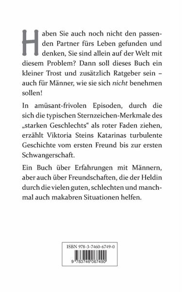 Haben Sie auch noch nicht den passenden Partner fürs Leben gefunden und denken, Sie sind allein auf der Welt mit diesem Problem? Dann soll dieses Buch ein kleiner Trost und zusätzlich Ratgeber sein - auch für Männer, wie sie sich nicht benehmen sollen!In amüsant-frivolen Episoden, durch die sich die typischen Sternzeichen-Merkmale des "starken Geschlechts" als roter Faden ziehen, erzählt Viktoria Steins Katarinas turbulente Geschichte vom ersten Freund bis zur ersten Schwangerschaft.Ein Buch über Erfahrungen mit Männern, aber auch über Freundschaften, die der Heldin durch die vielen guten, schlechten und manchmal auch makabren Situationen helfen.