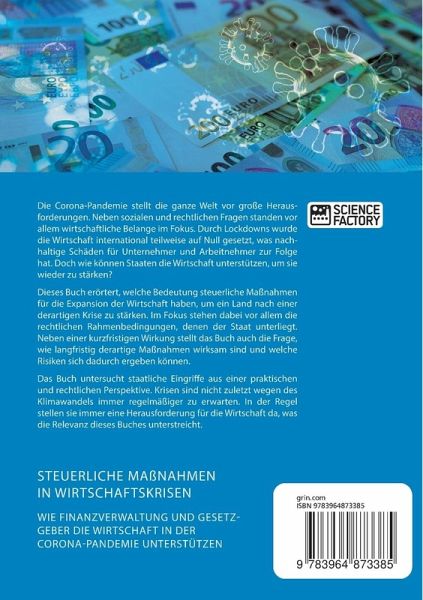 Die Corona-Pandemie stellt die ganze Welt vor große Herausforderungen. Neben sozialen und rechtlichen Fragen standen vor allem wirtschaftliche Belange im Fokus. Durch Lockdowns wurde die Wirtschaft international teilweise auf Null gesetzt, was nachhaltige Schäden für Unternehmer und Arbeitnehmer zur Folge hat. Doch wie können Staaten die Wirtschaft unterstützen, um sie wieder zu stärken? Dieses Buch erörtert, welche Bedeutung steuerliche Maßnahmen für die Expansion der Wirtschaft haben, um ein Land nach einer derartigen Krise zu stärken. Im Fokus stehen dabei vor allem die rechtlichen Rahmenbedingungen, denen der Staat unterliegt. Neben einer kurzfristigen Wirkung stellt das Buch auch die Frage, wie langfristig derartige Maßnahmen wirksam sind und welche Risiken sich dadurch ergeben können. Das Buch untersucht staatliche Eingriffe aus einer praktischen und rechtlichen Perspektive. Krisen sind nicht zuletzt wegen des Klimawandels immer regelmäßiger zu erwarten. In der Regel stellen sie immer eine Herausforderung für die Wirtschaft da, was die Relevanz dieses Buches unterstreicht. Aus dem Inhalt:-Covid-19;-Steuerrecht;-Corona-Steuerhilfegesetz;-Bürokratie;-OECD