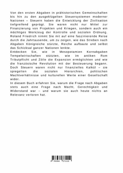 Von den ersten Abgaben in prähistorischen Gemeinschaften bis hin zu den ausgeklügelten Steuersystemen moderner Nationen - Steuern haben die Entwicklung der Zivilisation tiefgreifend geprägt. Sie waren nicht nur Mittel zur Finanzierung von Projekten und Kriegen, sondern auch ein mächtiges Werkzeug der Kontrolle und sozialen Ordnung. Roland Friedrich nimmt Sie mit auf eine faszinierende Reise durch die Jahrtausende, um zu zeigen, wie das Streben nach Abgaben Königreiche stürzte, Reiche aufbaute und selbst das Schicksal ganzer Nationen lenkte.Entdecken Sie, wie in Mesopotamien Kornabgaben Tempelwirtschaften stützten, wie im antiken Rom Tributpflicht und Zölle die Expansion ermöglichten und wie die französische Revolution mit der Besteuerung begann. Doch Steuern waren nicht nur finanzielles Kalkül - sie spiegelten die sozialen Hierarchien, politischen Machtverhältnisse und kulturellen Werte einer Gesellschaft wider.In diesem Buch erfahren Sie, warum die Frage nach Abgaben stets auch eine Frage nach Macht, Gerechtigkeit und Widerstand war - und warum sie auch heute nichts an Relevanz verloren hat.