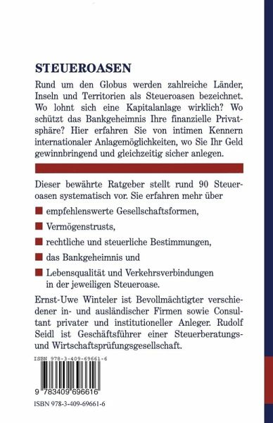 Einführung.- Allgemeines.- Warum Interesse an Steueroasen?.- Was sind Steueroasen?.- Warum gibt es Steueroasen?.- Auswahl der Steueroasen.- Der "Aha-Effekt".- Glaubwürdigkeit.- Verkehrsverbindungen.- Kommunikation.- Wohnsitznahme.- Lebensqualität.- Politische Risiken.- Währung und Devisenkontrollen.- Rechtssystem.- Auslieferungsabkommen.- Patentschutz.- Bankgeheimnis.- Gesellschaften.- Gesellschaftsformen.- Geschäftszweck.- Gesellschaftsgründung.- Örtliche Helfer, Gründungsberater und Treuhänder.- Wahrung Ihrer Anonymität.- Gründung auf dem Postwege.- Schutz vor Veruntreuung der Direktoren.- Vermögenstrusts.- Wo können Sie einen Vermögenstrust errichten?.- Rechtliche und steuerliche Behandlung von Treuvermögen in Deutschland.- Doppelbesteuerungsabkommen.- Steuern.- Steuerfreiheitsgarantien.- Die ideale Steueroase.- 1: Empfehlenswert oder nicht? Die wichtigsten Steueroasen für Wohnsitz, Vermögenstrusts oder Firmengründung.- Auf einen Blick.- Kartenskizzen mit den wichtigsten Steueroasen.- Europa.- Amerika.- Nahost und Afrika.- Asien und Pazifik.- Europa.- Andorra.- Campione.- Gibraltar.- Großbritannien.- Irland und Shannon.- Isle of Man.- Kanal-Inseln (Jersey, Guernsey, Alderney, Sark).- Liechtenstein.- Luxemburg.- Malta.- Monaco.- Niederlande.- Schweiz.- Zypern.- Amerika.- Bahamas.- Bermuda.- Britische Jungferninseln.- Cayman-Inseln.- Costa Rica.- Karibik-Inseln (Anguilla, Antigua, Barbuda, Redonda, Barbados, Jamaika, Montserrat, St.Kitts-Nevis, St.Lucia, St.Vincent, Trinidad und Tobago).- Niederländische Antillen.- Panama.- Turks- und Caicos-Inseln.- Nahost.- Vereinigte Arabische Emirate.- Bahrain.- Asien und Pazifik.- Hongkong.- Malaysia (Labuan).- Nauru.- Vanuatu.- 2: Oasen - wenn Sie Arbeitsplätze schaffen.- Belize: Gute Enteignungsversicherung angeraten.- Fidschi-Inseln: Der Handelskammer-Sekretär als Steuer-Hiwi.- Haiti: Steuerbefreiung und Trostlosigkeit.- Indonesien: Steuervorteile mit Bürokratie und Bakschisch.- Indien: 21 Anreize in der Steuerwüste.- Mauritius: Zucker für Fabrikanten.- Nordirland: Industrieförderung und Religionskrieg.- Pakistan: Steuerfreiheit für den Export.- Puerto Rico: Ein Fuß auf dem US-Markt.- Singapur: Industrie- und Off-Shore-Banken.- Sri Lanka: Industrie, Banken und Pensionäre.- Südkorea: Joint Ventures mit Koreanern.- Taiwan: Industrie und Handel - Die asiatische Fast-Oase.- Tunesien: Führungskräfte ohne Angst.- 3: Oasen nur für Sonderfälle - wenn überhaupt.- Belgien: Rabatt für ausländische Manager.- Österreich.- Ceuta und Melilla: Spanien mit Steuerrabatt.- Französische Pazifik-Inseln: Keine Gauguin-Idylle mehr.- Freizone Genf: Arbeitsbewilligung in der Schweiz.- Guadeloupe und Martinique: Frankreich in der Karibik.- Livigno: Klein-Tibet in der Schweiz.- Os de Civis: "Klein-Andorra" in der EU.- Südtirol: Die Fast-Steueroase.- Kleinwalsertal und Jungholz: Anonymkonten mit deutscher Währung.- Australien: Immobilien und Doppelbesteuerungsabkommen.- 4: Ferner liefen ... Oasen, die keine sind.- Australische Pazifikinseln (Norfolk Island, Christmas Island, Cocos Islands): Wenn, dann nur für Australier.- Büsingen: "Steueroase" mit deutschem Finanzamt.- Delaware/USA: Das blaue Steuerwunder.- Israel: Steuerdschungel.- Italien: De jure eine Wüste, de facto ein Paradies.- Liberia: Chaos und Bürgerkrieg.- Macao: Hongkong auf Sparflamme.- Marshall-Inseln: Unglaubwürdiger Newcomer.- Neuseeländische Pazifik-Inseln (Cook-Inseln): Keine "Südsee-Schweiz".- Philippinen: Ausländer als Milchkühe.- Réunion: Am besten für Aussteiger.- San Marino: Briefmarken, Adelstitel und Souvenirs.- Sealand: Prince Roy träumt.- Seychellen: Die "Ex-und-Hopp"-Zusammenklappfirmen.- St. Helena: Ungeeigneter Verbannungsort.- Tanger: Nur für Nostalgiker.- Uruguay: Einst die Schweiz Südamerikas.- Die Autoren.