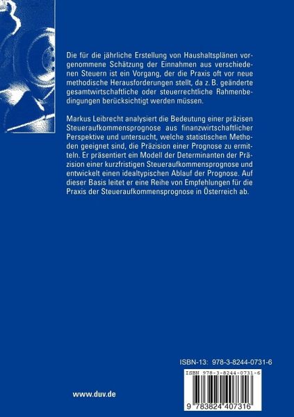 Markus Leibrecht analysiert die Bedeutung einer präzisen Steueraufkommensprognose aus finanzwirtschaftlicher Perspektive und untersucht, welche statistischen Methoden geeignet sind, die Präzision einer Prognose zu ermitteln. Er präsentiert ein Modell der Determinanten der Präzision einer kurzfristigen Steueraufkommensprognose und entwickelt einen idealtypischen Ablauf der Prognose. Auf dieser Basis leitet er eine Reihe von Empfehlungen für die Praxis der Steueraufkommensprognose in Österreich ab.