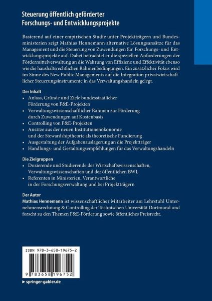 Basierend auf einer empirischen Studie unter Projektträgern und Bundesministerien zeigt Mathias Hennemann alternative Lösungsansätze für das Management und die Steuerung von Zuwendungen für Forschungs- und Entwicklungsprojekte auf. Dabei betrachtet er die speziellen Anforderungen der Fördermittelverwaltung an die Wahrung von Effizienz und Effektivität ebenso wie die haushaltsrechtlichen Rahmenbedingungen. Ein zusätzlicher Fokus wird im Sinne des New Public Managements auf die Integration privatwirtschaftlicher Steuerungsinstrumente in das Verwaltungshandeln gelegt.