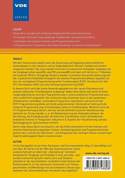 Mit dem Steuerrelais easyE4 kann die Steuerung und Regelung unterschiedlicher Anwendungen in der Industrie und im Gebäudebereich effizient, flexibel und einfach umgesetzt werden! Das neue easyE4-Sortiment ist wesentlich kompakter aufgebaut als die Vorgängerreihen easy500, easy700 und easy800 und lässt sich mit bis zu 11 Modulen auf maximal 188 Ein-/Ausgänge flexibel erweitern und bietet eine große Spannungsvielfalt. Zusätzliche Flexibilität ermöglicht die intuitive Programmiersoftware easySoft 7 mit den vier verfügbaren Programmiersprachen Funktionsplan (FUP), Strukturierter Text (ST), Kontaktplan (KOP) und easy Geräteprogrammierung (EDP).In diesem Buch wird das breite Anwendungsspektrum der neuen Kleinsteuerung anhand zahlreicher Praxisbeispiele aufgezeigt. Neben dem Gerät und seinen Erweiterungsmöglichkeiten wird die Programmierung in unterschiedlichen Programmiersprachen ausführlich vorgestellt. Der erfahrene easy-Anwender kann in den gewohnten Arbeitsweisen verbleiben, vorhandene Programme importieren und auch mit der EDP-Programmierung direkt am Gerät programmieren. Demonstriert wird auch die moderne Programmierung im Kontaktplan sowie im Funktionsplan. Weiterhin wird die ST-Programmierung erläutert, die hier auf die Anforderung einer Kleinsteuerung optimiert ist. Ferner werden u. a. die Modularisierung der Anwendersoftware, die Vernetzung, die Einbindung über die Ethernet-Schnittstelle in IIoT-Architekturen (Industrial Internet of Things) bzw. Industrie 4.0, Aspekte der Visualisierung und das Datenlogging per Speicherkarte erörtert.Damit zeigt dieses Buch anschaulich, wie das Elektrohandwerk mit dem kleinen und smarten Automatisierungssystem Kosten, Ausbildungszeiten und Programmierzeiten sparen kann und wie der Maschinen- und Anlagenbau bei niedrigen Kosten und geringer Expertenabhängigkeit Ideen umsetzen kann.