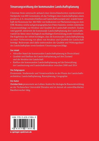 Christian Stein untersucht anhand einer deutschlandweiten repräsentativen Stichprobe von 600 Gemeinden, ob das Vorliegen eines Landschaftsplans einen positiven, d. h. steuernden Einfluss auf Landschaftszustand und -wandel innerhalb der Kommune hat. Mit Hilfe von Indikatoren zur Flächennutzung aus dem IÖR-Monitor, welche auf geotopographischen Daten basieren, werden statistische Zusammenhänge zur Struktur und Qualität der Landschaft ermittelt. Zudem wird geprüft, inwieweit die kommunale Landschaftsplanung den Landschaftswandel im Sinne einer ökologisch nachhaltigen Entwicklung positiv beeinflusst. Die Ergebnisse der Arbeit bestätigen, dass die kommunale Landschaftsplanung zu einer Verbesserung vor allem von Struktur und Qualität der Landschaft beiträgt. Bedeutsam sind dafür insbesondere deren Qualität und Wirkungsdauer sowie konkrete Umsetzungsvorschläge.