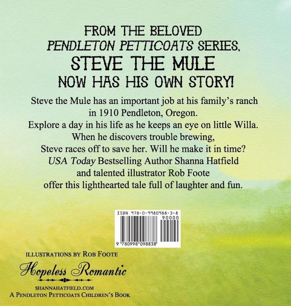 From the beloved Pendleton Petticoats series, Steve the Mule now has his own story! Steve the Mule has an important job at his family's ranch in 1910 Pendleton, Oregon. Explore a day in his life as he keeps an eye on little Willa. When he discovers trouble brewing, Steve races off to save her. Will he make it in time? USA Today Bestselling Author Shanna Hatfield and talented illustrator Rob Foote offer this lighthearted tale full of laughter and fun.