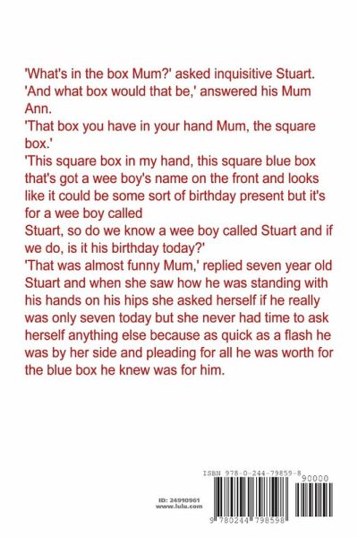 'What's in the box Mum?' asked inquisitive Stuart. 'And what box would that be,' answered his Mum Ann. 'That box you have in your hand Mum, the square box.' 'This square box in my hand, this square blue box that's got a wee boy's name on the front and looks like it could be some sort of birthday present but it's for a wee boy called Stuart, so do we know a wee boy called Stuart and if we do, is it his birthday today?' 'That was almost funny Mum,' replied seven year old Stuart and when she saw how he was standing with his hands on his hips she asked herself if he really was only seven today but she never had time to ask herself anything else because as quick as a flash he was by her side and pleading for all he was worth for the blue box he knew was for him.