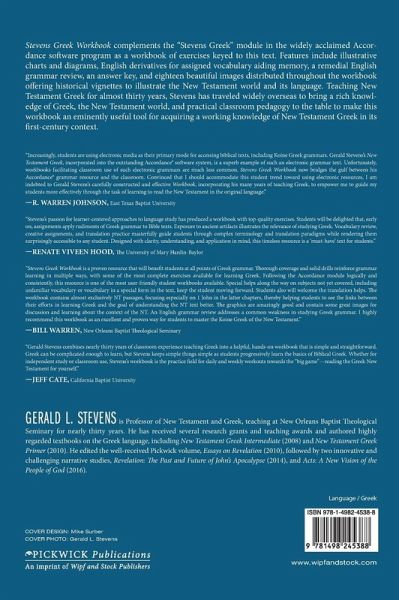 Stevens Greek Workbook complements the "Stevens Greek" module in the widely-acclaimed Accordance software program as a workbook of exercises keyed to this text. Features include illustrative charts and diagrams, English derivatives for assigned vocabulary aiding memory, a remedial English grammar review, an answer key, and eighteen beautiful images distributed throughout the workbook offering historical vignettes to illustrate the New Testament world and its language. Teaching New Testament Greek for almost thirty years, Stevens has traveled widely overseas to bring a rich knowledge of Greek, the New Testament world, and practical classroom pedagogy to the table to make this workbook an eminently useful tool for acquiring a working knowledge of New Testament Greek in its first-century context.