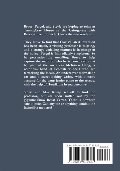 Bruce, Fergal, and Stevie are hoping to relax at Tammybrae House in the Cairngorms with Bruce's inventor uncle, Clovis the mackerel cat. They arrive to find that Clovis's latest invention has been stolen, a visiting professor is missing, and a strange yodelling marmot is in charge of the house. Fergal is immediately suspicious. So he persuades the unwilling Bruce to help capture the marmot, who he is convinced must be part of the merciless McKitten Gang, a notorious band of Scottish wildcats who are terrorising the locals. An undercover marmalade cat and a sweet-looking widow with a nasty surprise for the gang leader come to the rescue, with the help of Henrik the hyena detective. Stevie and Max Rump set off to find the professor, but are soon sniffed out by the gigantic Snow Beast Terror. There is nowhere safe to hide. Can anyone or anything combat the invincible monster?