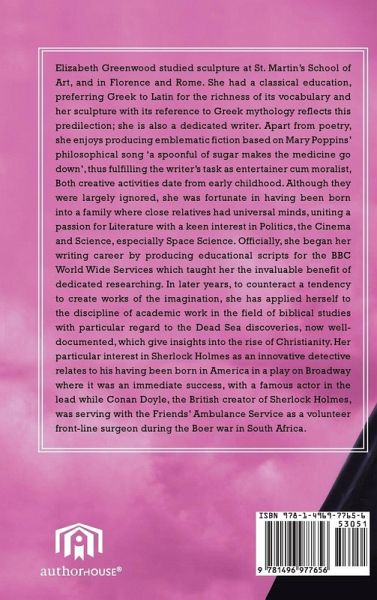 Elizabeth Greenwood studied sculpture at St. Martin's School of Art, and in Florence and Rome. She had a classical education, preferring Greek to Latin for the richness of its vocabulary and her sculpture with its reference to Greek mythology reflects this predilection; she is also a dedicated writer. Apart from poetry, she enjoys producing emblematic fiction based on Mary Poppins' philosophical song 'a spoonful of sugar makes the medicine go down', thus fulfilling the writer's task as entertainer cum moralist, Both creative activities date from early childhood. Although they were largely ignored, she was fortunate in having been born into a family where close relatives had universal minds, uniting a passion for Literature with a keen interest in Politics, the Cinema and Science, especially Space Science. Officially, she began her writing career by producing educational scripts for the BBC World Wide Services which taught her the invaluable benefit of dedicated researching. In later years, to counteract a tendency to create works of the imagination, she has applied herself to the discipline of academic work in the field of biblical studies with particular regard to the Dead Sea discoveries, now well-documented, which give insights into the rise of Christianity. Her particular interest in Sherlock Holmes as an innovative detective relates to his having been born in America in a play on Broadway where it was an immediate success, with a famous actor in the lead while Conan Doyle, the British creator of Sherlock Holmes, was serving with the Friends' Ambulance Service as a volunteer front-line surgeon during the Boer war in South Africa.