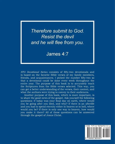 Have you ever....Thought about the afterlife? Do you want to be sure that you're going to heaven for eternity? Do you want to develop a closer relationship with God through the Lord Jesus Christ? Do you want to have greater knowledge of the Bible and a better understanding of God's word? If you answered "Yes" to any of these questions, then STG Devotional Series is a book for you! STG (Submit to God) Devotional Series is a collection of 52 Christian Weekly Devotionals. Each devotional is based on the favorite bible verses of my family, friends, and acquaintances. This Book Contains: 52 Passages of Scripture: To deepen your knowledge of both the Old and New Testaments Context: To give you a brief background study on why the author wrote the selected Scriptures Main Points: To help you understand what the author tried to convey in the Scriptures Conclusion: To show you how each of the Scripture passages point to the gospel of Jesus Christ Discussion Questions: To challenge and deepen your understanding of the selected Scriptures, as well as to apply it in your everyday life Through this book, you can:Develop an eternal perspective and think more about the afterlife Be sure that you're going to heaven for eternity Develop a stronger relationship with God through His Son Jesus Christ Acquire greater knowledge of the Bible and develop a better understanding of the scriptures So if you seek to know the Lord Jesus Christ and draw closer to Him, click "Buy Now" today to help you in your pursuit of righteousness! "Behold, now is the acceptable time; Behold now is the day of salvation (2 Corinthians 6:2)."