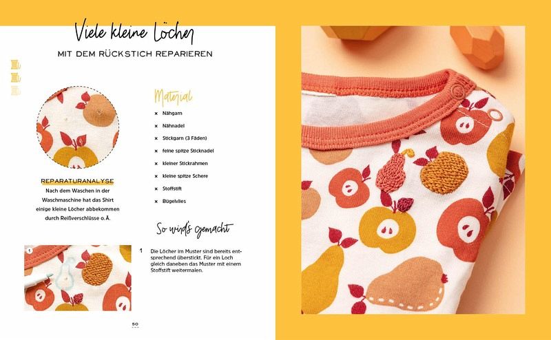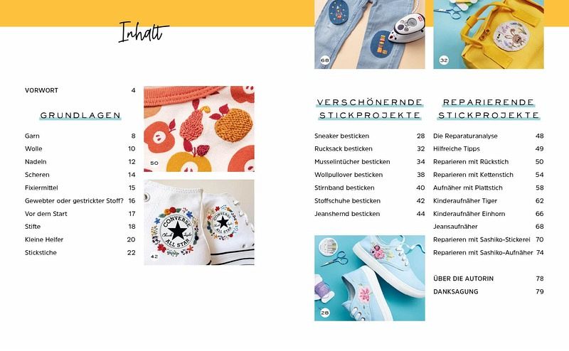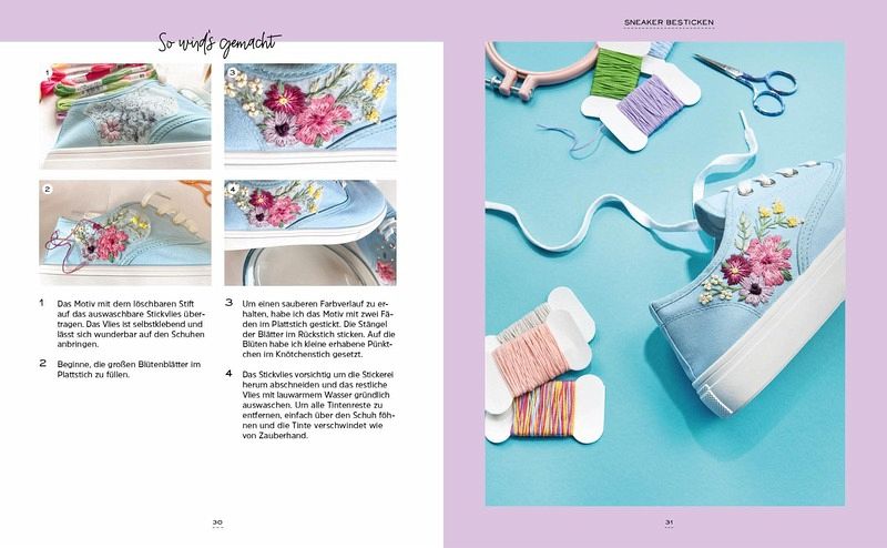 - Anschauliche Step-by-Step-Anleitungen zeigen exemplarisch, wie schön Sachen mit Stickgarn-und Nadel individualisiert werden können