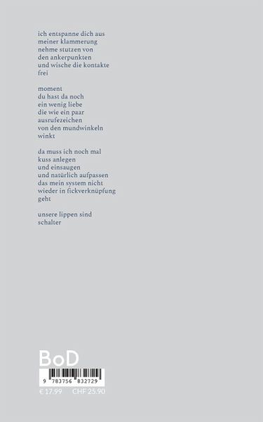 ich entspanne dich ausmeiner klammerungnehme stutzen vonden ankerpunktenund wische die kontaktefreimomentdu hast da nochein wenig liebedie wie ein paarausrufezeichenvon den mundwinkelnwinktda muss ich noch malkuss anlegenund einsaugenund natürlich aufpassendas mein system nichtwieder in fickverknüpfunggehtunsere lippen sindschalter