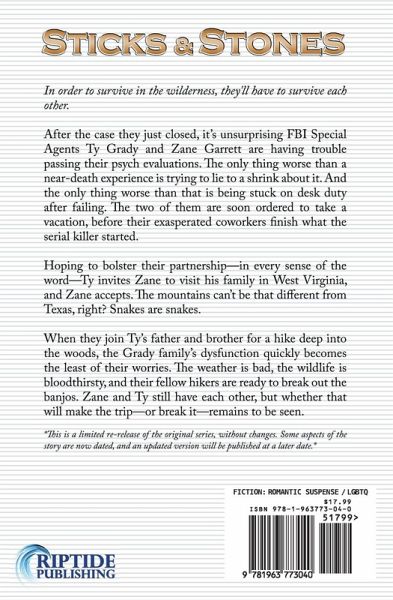In order to survive in the wilderness, they'll have to survive each other. After the case they just closed, it's unsurprising FBI Special Agents Ty Grady and Zane Garrett are having trouble passing their psych evaluations. The only thing worse than a near-death experience is trying to lie to a shrink about it. And the only thing worse than that is being stuck on desk duty after failing. The two of them are soon ordered to take a vacation, before their exasperated coworkers finish what the serial killer started. Hoping to bolster their partnership-in every sense of the word-Ty invites Zane to visit his family in West Virginia, and Zane accepts. The mountains can't be that different from Texas, right? Snakes are snakes. When they join Ty's father and brother for a hike deep into the woods, the Grady family's dysfunction quickly becomes the least of their worries. The weather is bad, the wildlife is bloodthirsty, and their fellow hikers are ready to break out the banjos. Zane and Ty still have each other, but whether that will make the trip-or break it-remains to be seen. *This is a limited re-release of the original series, without changes. Some aspects of the story are now dated, and an updated version will be published at a later date.* **See this title's page on RiptidePublishing.com for content warnings.**