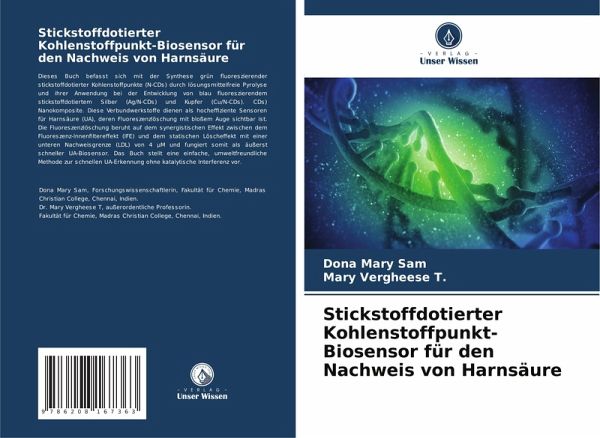Dieses Buch befasst sich mit der Synthese grün fluoreszierender stickstoffdotierter Kohlenstoffpunkte (N-CDs) durch lösungsmittelfreie Pyrolyse und ihrer Anwendung bei der Entwicklung von blau fluoreszierendem stickstoffdotiertem Silber (Ag/N-CDs) und Kupfer (Cu/N-CDs). CDs) Nanokomposite. Diese Verbundwerkstoffe dienen als hocheffiziente Sensoren für Harnsäure (UA), deren Fluoreszenzlöschung mit bloßem Auge sichtbar ist. Die Fluoreszenzlöschung beruht auf dem synergistischen Effekt zwischen dem Fluoreszenz-Innenfiltereffekt (IFE) und dem statischen Löscheffekt mit einer unteren Nachweisgrenze (LDL) von 4 µM und fungiert somit als äußerst schneller UA-Biosensor. Das Buch stellt eine einfache, umweltfreundliche Methode zur schnellen UA-Erkennung ohne katalytische Interferenz vor.