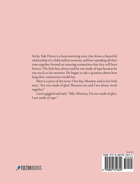 Sticky Side Down is a heartwarming story that shows a beautiful relationship of a child and his mommy and how spending all their time together formed an amazing connection that they will have forever. The little boy always said he was made of tape because he was stuck to his mommy. He began to ask a question about how long their connection would last. Here is a piece of the story: One day, Mommy said to her little man, "Are you made of glue? Because you and I are always stuck together." Gavin giggled and said, "Silly, Mommy, I'm not made of glue. I am made of tape."