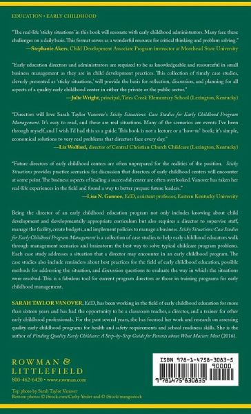 Preface 1.A Sticky Situation with Marketing & Enrollment 2.A Sticky Situation with Menu Planning 3.A Sticky Situation with Parent Complaints 4.A Sticky Situation with Dress Code 5.A Sticky Situation with Cell Phones 6.A Sticky Situation with Biting 7.A Sticky Situation with Confidentiality 8.A Sticky Situation with Parent Feedback 9.A Sticky Situation with Staff Gossip 10.A Sticky Situation with Social Media 11.A Sticky Situation with Staff Playground Behavior 12.A Sticky Situation with Parent Behavior 13.A Sticky Situation with Annual Evaluations 14.A Sticky Situation with an Advisory Board 15.A Sticky Situation with Facility Management 16.A Sticky Situation with Weather Cancellations 17.A Sticky Situation with Staff Interviews 18.A Sticky Situation with Parent Education Nights 19.A Sticky Situation with Fundraising 20.A Sticky Situation with Staff Turnover 21.A Sticky Situation with Staff Professional Development 22.A Sticky Situation with Scheduling 23.A Sticky Situation with Transportation 24.A Sticky Situation with Staff Wages About the Author