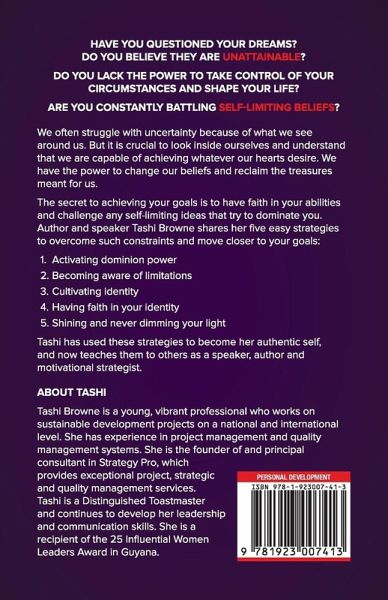 HAVE YOU QUESTIONED YOUR DREAMS? DO YOU BELIEVE THEY ARE UNATTAINABLE? DO YOU LACK THE POWER TO TAKE CONTROL OF YOUR CIRCUMSTANCES AND SHAPE YOUR LIFE? ARE YOU CONSTANTLY BATTLING SELF-LIMITING BELIEFS? We often struggle with uncertainty because of what we see around us. But it is crucial to look inside ourselves and understand that we are capable of achieving whatever our hearts desire. We have the power to change our beliefs and reclaim the treasures meant for us. The secret to achieving your goals is to have faith in your abilities and challenge any self-limiting ideas that try to dominate you. Author and speaker Tashi Browne shares her five easy strategies to overcome such constraints and move closer to your goals:Activating dominion power Becoming aware of limitations Cultivating identity Having faith in your identity Shining and never dimming your light Tashi has used these strategies to become her authentic self, and now teaches them to others as a speaker, author and motivational strategist.