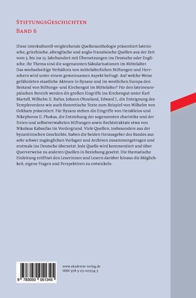 Diese interkulturell-vergleichend angelegte Quellenanthologie präsentiert lateinische, griechische, altenglische und anglo-französische Quellen aus der Zeit vom 5. bis ins 15. Jahrhundert mit Übersetzungen ins Deutsche oder Englische. Ihr Thema sind die sogenannten Säkularisationen im Mittelalter. Das wechselseitige Verhältnis von mittelalterlichen Stiftungen und Herrschern wird unter einem gemeinsamen Aspekt befragt: Auf welche Weise gefährdeten staatliche Akteure in Byzanz und im westlichen Europa den Bestand von Stiftungs- und Kirchengut im Mittelalter? Für den lateineuropäischen Bereich werden die großen Eingriffe ins Kirchengut unter Karl Martell, Wilhelm II. Rufus, Johann Ohneland, Edward I., die Enteignung des Templerordens wie auch theoretische Texte zum Beispiel von Wilhelm von Ockham präsentiert. Für Byzanz stehen die Eingriffe von Herakleios und Nikephoros II. Phokas, die Entstehung der sogenannten charistike und der freien und selbstverwalteten Stiftungen sowie Rechtstraktate etwa von Nikolaus Kabasilas im Vordergrund. Viele Quellen, insbesondere aus der byzantinischen Geschichte, haben die beiden Herausgeber des Bandes aus sehr schwer zugänglichen Vorlagen und Archiven zusammengetragen und erstmals ins Deutsche übersetzt. Jede Quelle wird kommentiert und über Querverweise zu anderen Quellen in Beziehung gesetzt. Die thematische Einleitung eröffent den Leserinnen und Lesern darüber hinaus die Möglichkeit, eigene Fragen und Perspektiven zu entwickeln.