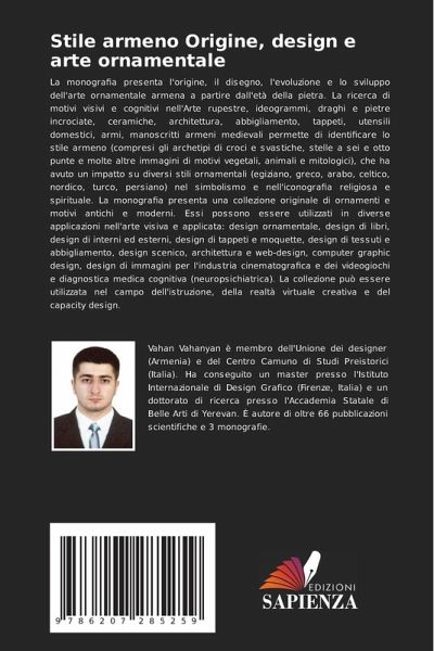 La monografia presenta l'origine, il disegno, l'evoluzione e lo sviluppo dell'arte ornamentale armena a partire dall'età della pietra. La ricerca di motivi visivi e cognitivi nell'Arte rupestre, ideogrammi, draghi e pietre incrociate, ceramiche, architettura, abbigliamento, tappeti, utensili domestici, armi, manoscritti armeni medievali permette di identificare lo stile armeno (compresi gli archetipi di croci e svastiche, stelle a sei e otto punte e molte altre immagini di motivi vegetali, animali e mitologici), che ha avuto un impatto su diversi stili ornamentali (egiziano, greco, arabo, celtico, nordico, turco, persiano) nel simbolismo e nell'iconografia religiosa e spirituale. La monografia presenta una collezione originale di ornamenti e motivi antichi e moderni. Essi possono essere utilizzati in diverse applicazioni nell'arte visiva e applicata: design ornamentale, design di libri, design di interni ed esterni, design di tappeti e moquette, design di tessuti e abbigliamento, design scenico, architettura e web-design, computer graphic design, design di immagini per l'industria cinematografica e dei videogiochi e diagnostica medica cognitiva (neuropsichiatrica). La collezione può essere utilizzata nel campo dell'istruzione, della realtà virtuale creativa e del capacity design.