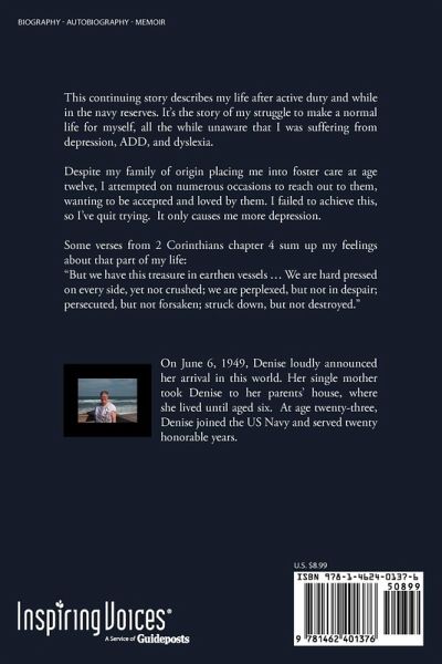 This continuing story describes my life after active duty and while in the navy reserves. It's the story of my struggle to make a normal life for myself, all the while unaware that I was suffering from depression, ADD, and dyslexia. Despite my family of origin placing me into foster care at age twelve, I attempted on numerous occasions to reach out to them, wanting to be accepted and loved by them. I failed to achieve this, so I've quit trying. It only causes me more depression. Some verses from 2 Corinthians chapter 4 sum up my feelings about that part of my life: "But we have this treasure in earthen vessels … We are hard pressed on every side, yet not crushed; we are perplexed, but not in despair; persecuted, but not forsaken; struck down, but not destroyed."