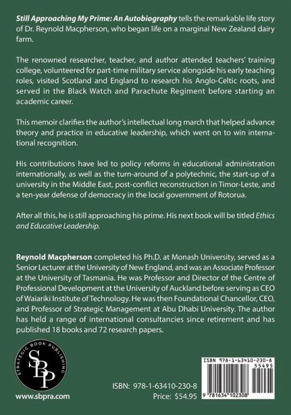 Still Approaching My Prime: An Autobiography tells the remarkable life story of Dr. Reynold Macpherson, who began life on a marginal New Zealand dairy farm.The renowned researcher, teacher, and author attended teachers' training college, volunteered for part-time military service alongside his early teaching roles, visited Scotland and England to research his Anglo-Celtic roots, and served in the Black Watch and Parachute Regiment before starting an academic career.This memoir clarifies the author's intellectual long march that helped advance theory and practice in educative leadership, which went on to win international recognition.His contributions have led to policy reforms in educational administration internationally, as well as the turn-around of a polytechnic, the start-up of a university in the Middle East, post-conflict reconstruction in Timor-Leste, and a ten-year defense of democracy in the local government of Rotorua.After all this, he is still approaching his prime. His next book will be titled Ethics and Educative Leadership.(About the Author)Reynold Macpherson completed his Ph.D. at Monash University, served as a Senior Lecturer at the University of New England, and was an Associate Professor at the University of Tasmania. He was Professor and Director of the Centre of Professional Development at the University of Auckland before serving as CEO of Waiariki Institute of Technology. He was then Foundational Chancellor, CEO, and Professor of Strategic Management at Abu Dhabi University. The author has held a range of international consultancies since retirement and has published 18 books and 72 research papers.