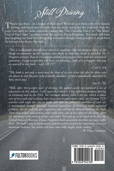 They're out there...in a league of their own! We've all seen them with their bizarre driving techniques and vehicles that are more suited for the junkyard than the road. Get ready for some enjoyable reading like "The Umbrella Policy" or "The Many Uses of Duct Tape," as observed by the author, Diana Pengitore. This book will have you laughing out loud over things that you never thought were possible. A must-have for anyone who shares the road. "This is a delightful journey over America's roadways that encompasses many of the things we encounter on the highways that make us shake our heads in disbelief. Dr. Pengitore presents these in a humorous fashion and peppers them with her whimsical comments. A page turner that will leave you howling...and, if it so happens that you see yourself in this book...well, FIX IT!" -Carl F., VA "This book is not only a must-read for those of us who drive but also for those who are about to and for some who probably shouldn't (if you're anecdotally described in here, that's you)." -Jan D., NJ "Well, after thirty-eight years of driving, the author surely has gathered a lot of experience on this subject. I will agree that there is a big difference between driving in Germany and in the USA. The German's dearest child is the car, which is taken care of very well and is always kept clean and in good repair. And, the German TÜV watches with eagle eyes just to make sure that the technical condition of each car is maintained through thorough biennial inspections. If there is a major technical problem, the car will not pass inspection and will not be allowed back on the road. Then there is law enforcement, who really takes care of the safety on the street. After all, Germany is the country of law and order! Then you go to the land of the free, the United States of America. Diana Pengitore's book accurately describes everyday traffic there. The book is easy to understand, and the author presents her experiences in a very humorous manner. You surely will have some belly laughs while reading." -W. Fries, Germany