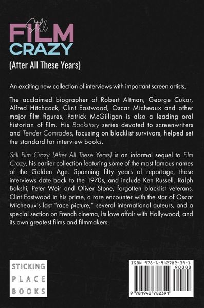 An exciting new collection of interviews with important screen artists. The acclaimed biographer of Robert Altman, George Cukor, Alfred Hitchcock, Clint Eastwood, Oscar Micheaux and other major film figures, Patrick McGilligan is also a leading oral historian of film. His Backstory series devoted to screenwriters and Tender Comrades, focusing on blacklist survivors, helped set the standard for interview books. Still Film Crazy (After All These Years) is an informal sequel to Film Crazy, his earlier collection featuring some of the most famous names of the Golden Age. Spanning fifty years of reportage, these interviews date back to the 1970s, and include Ken Russell, Ralph Bakshi, Peter Weir and Oliver Stone, forgotten blacklist veterans, Clint Eastwood in his prime, a rare encounter with the star of Oscar Micheaux's last "race picture," several international auteurs, and a special section on French cinema, its love affair with Hollywood, and its own greatest films and filmmakers.