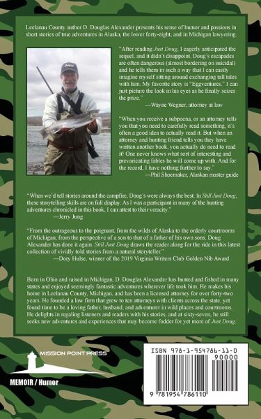 Leelanau County author D. Douglas Alexander writes mostly true stories about his varied hunting, life adventures, and legal experiences, usually with a humorous take on them all. From courtrooms across southeast Michigan to the wilderness of Alaska, he takes the reader on a wild ride via varied short stories intended to amuse and provoke thought. Whether fighting the elements in harsh weather or criticizing law enforcement and the judiciary, he never loses his sense of humor, respect for Mother Nature, and the joy of being a father, husband, storyteller, archer, hunter, fisherman, and amateur chef. This collection of stories is eclectic, moving, and intended to entertain and appeal to a broad audience. A former friend denigrated his stories as being "Just Doug," hence the title.