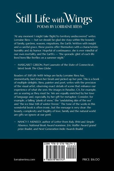 From a lifetime of experience, Lorraine Riess - Poet Laureate of Haddam, Connecticut - sifts through the dichotomy of moving from an active west coast life to the east coast. Navigating life as a transplant conjures up the urge to resist feeling that latter life is mere epilogue. There is a conscious attention to memory, environment, and the consequences of action and inaction as they become part of the legacy we leave behind. She weighs in on hope, love, and family in search of the fulcrum point that finds equilibrium between the repercussions of experience and where it takes flight into its larger meaning. Riess guides us through this balancing act with sincerity and humor, ever mindful of the resilience of the human heart as it forges ahead.