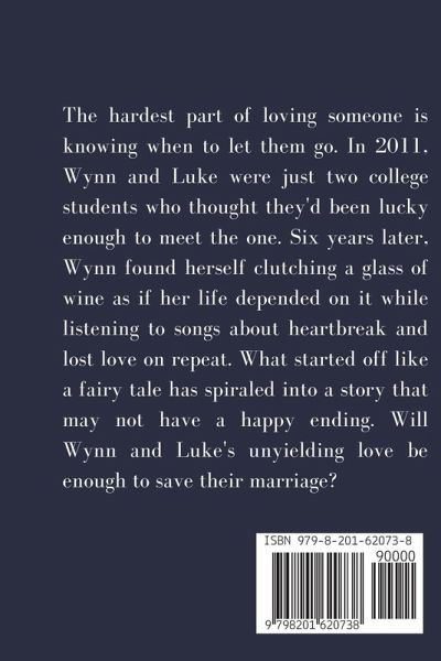 The hardest part of loving someone is knowing when to let them go. In 2011, Wynn and Luke were just two college students who thought they'd been lucky enough to meet the one. Six years later, Wynn found herself clutching a glass of wine as if her life depended on it while listening to songs about heartbreak and lost love on repeat. What started off like a fairy tale has spiraled into a story that may not have a happy ending. Will Wynn and Luke's unyielding love be enough to save their marriage?